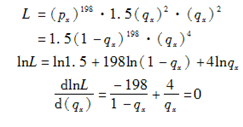 对于评估区间(x,x+1],假定:如果nx=200,并且观察到2个死亡者,一个死亡发生在x+0.5岁,另一个死亡发生在x+0.86岁,则qx的极大似然估计为( )。