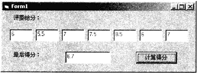 [填空题]以下是一个比赛评分程序。在窗体上建立一个名为Text1的文本框数组,然后画一个名为Text2的文本框和名为Command1的命令按钮。运行时在文本框数组中输入7个分数,单击“计算得分”命令按钮,则最后得分显示在Text2文本框中(去掉一个最高分和一个最低分后的平均分即为最后得分),如图所示。请填空。