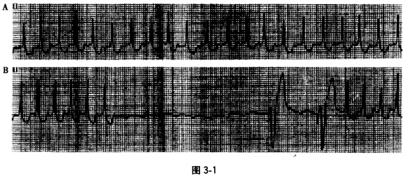 患者女,60岁,阵发性心悸5小时就诊,ECG如图3-1A,为窄QRS波群心动过速,心室率150次/分。图3—1B为心动过速发作时静脉推注三磷酸腺苷后心室停搏后紧急起搏心电图,其快速心律失常心电图诊断为