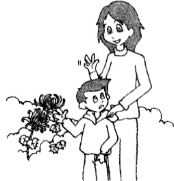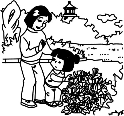 仔细看图,想一想图上画的是谁?什么时间?什么地方?她们在说什么?请根据提示,写几句话。