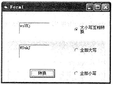 [多项选择题]在考生文件夹下有一个工程文件sjt4.vbp,窗体上有两个文本框、三个单选按钮和一个命令按钮。运行时,在Text1中输入若干个大写和小写字母,并选中一个单选按钮,再单击“转换”按钮,则按选中的单选按钮的标题进行转换,结果放在Text2中(如下图所示)。