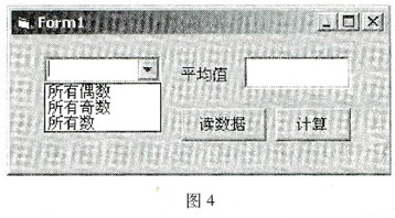 ②单击“计算”按钮,则根据从名称为Combo1的组合框中选中的项目,对数组a中的数据计算平均值,并将计算结果四舍五入取整后显示在文本框Text1中。