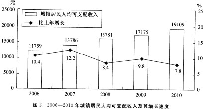 2010年,农村居民人均纯收入5919元,剔除价格因素,比上年实际增长10.9%;城镇居民人均可支配收入19109元,实际增长7.8%。农村居民家庭食品消费支出占消费总支出的比重为41.1%,城镇为35.7%。按2010年农村贫困标准1274元测算,年末农村贫困人口为2688万人,比上年末减少909万人。