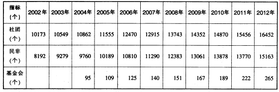 截至2012年底,全省共有社会团体16452个,比上年增长6.44%。按照社团活动范围划分,省级社团989个,地级社团4093个,县级社团11370个。按照社团服务的主要领域划分.科技研究类1272个,生态环境类309个,教育类949个,卫生类573个,社会服务类1784个,文化类1494个,体育类1237个,法律类184个,工商服务类2614个,宗教类332个,农业及农村发展类1195个,职业及从业组织类1877个,国际及其他涉及组织类20个,其他2612个。截至2012年底,全省共有民办非企业单位15163个,比上年增加10.12%,其中:科技研究类951.个,生态环境类342个,教育类9486个,卫生类805个,社会服务类1572个,文化类818个,体育类576个,法律类33个,工商服务类51个,宗教类1个,农业及农村发展类53个,职业及从业组织类116个,其他359个。截至2011年底,浙江省社会组织吸纳社会各类人员就业人数约为:A.28.7万人B.29.4万人C.30.8万人D.31.2万人2012年,下列哪项的同比增长最快?A.社会组织B.社会团体C.民办非企业单位D.基金会2012年,浙江省工商服务类社会团体的数量约占社会组织数量的:A.8.2%B.10.8%C.12.6%D.15.9%2012年,浙江省民办非企业单位的数量比2003年增加了:A.5884个B.5903个C.6279个D.6971个根据材料,下列表述正确的一项是:A.2005-2012年,浙江省基金会的数量同比增长速度都超过10%B.2012年,浙江省县级社团占全省社会团体总量的比重超过70%C.2012年,浙江省生态环境类民办非企业单位比生态环境类社会团体少33个D.2002-2012年,浙江省社会团体都比民办非企业单位多