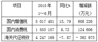 在Word中制作了一张关于某地区2015年1~6月的税收收入统计表如下: