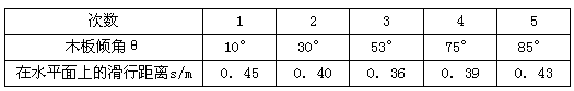 在验证猜想二的实验中,小明让一木块从斜面的同一高度滑下,但改变了斜面的倾角,测得的数据记录如下表: