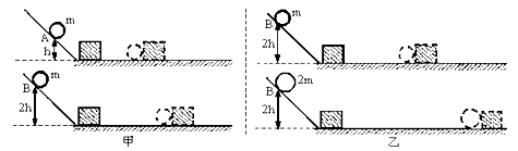 ②乙图中让不同质量的两个小球从同一高度滚下的目的是两球到达水平面时,具有相同的 .