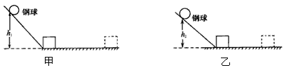 图是研究“物体动能的大小与哪些因素有关”的实验装置,实验中让同一钢球从同一斜面的不同高度(h1>h2)由静止滚下,打到同一个木块上,推动木块运动。