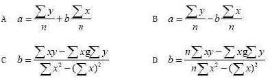 用最小平方法求解回归方程中两个参数a、b的值,正确的公式是()。