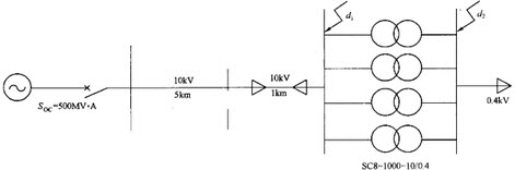 供电系统如下图所示,供电系统在最小运行方式下,试分别求出电源、10kV高压架空线、10kV高压电缆、变压器的电抗标幺值。(χo缆=0.08Ω/km,χo架=0.4Ω/km)