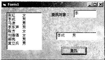 [填空题]如图所示,在列表框List1中已经有若干人的简单信息,运行时在Text1文本框(即“查找对象”右边的文本框)输入一个姓或姓名,单击“查找”按钮,则在列表框中进行查找,若找到,则把该人的信息显示在Text2文本框中。若有多个匹配的列表项,则只显示第1个匹配项;若未找到,则在Text2中显示“查无此人”。请填空。