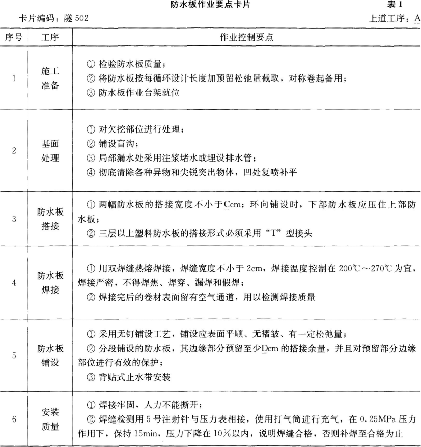 事件1:项目经理部编制了《防水板作业要点卡片》,见表1。