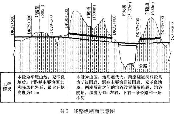 某新建双线铁路客运专线站前工程第二标段起讫里程为DK12+500~DK42+500,正线长度30km,其中DK28+500~DK33+500段的线路纵断面如图5所示。
