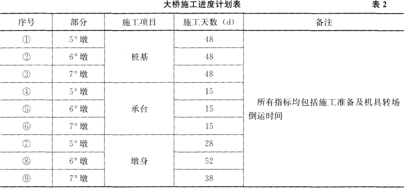事件3:项目经理部根据设计要求及现场施工条件,对大桥5#、6#、7#墩编制了施工组织设计:桩基施工采用冲击钻机1台,进度指标为4d/根;承台施工采用组合钢模1套,进度指标为15d/个;墩身施工采用翻模1套,进度指标为1m/d。大桥施工进度计划见表2所示。计划安排施工顺序为5#墩→6#墩→7#墩,据此按表2序号确定了施工关键线路,并计算了施工总天数。