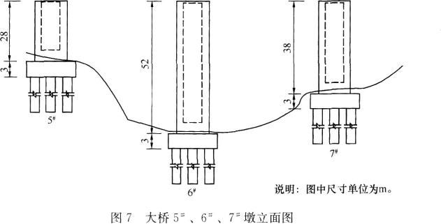 大桥1座,长348.86m,基础均为钻孔桩基,采用冲击钻机成孔;承台模板采用组合式钢模;其中5#、6#、7#墩桩基数量均为12根,墩身为空心薄壁墩,其模板采用翻模。