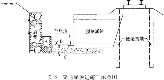 钢筋混凝土框架涵1处,跨径为1~5.0m,全长25横延米,为一交通涵。下穿既有线,采用顸进施工;既有线为无缝线路,交通涵位置的前后路基两侧采用挖孔桩防护;施工降水采用井点降水;地质为黏土及砂性土。为防止扎(低)头现象发生,在滑板上预留了仰坡,在涵体底板前端预留了船头坡。交通涵顶进施工示意如图6所示。