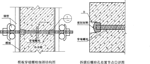 2.指出下面两图中A、B的名称,简述本工程采用穿墙螺栓的作用。