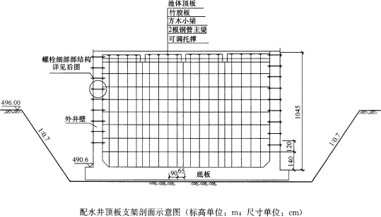 1.配水井顶板支架剖面示意图中基坑缺少哪些降、排水设施?顶板支架缺少哪些重要杆件?