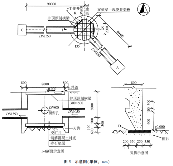 按批准的进度计划先集中力量完成y井的施工作业,按沉井预制工艺流程,在已测定的圆周中心线上按要求铺设粗砂与D,采用定型钢模进行刃脚混凝土浇筑,然后按顺序先设置E与F、安装绑扎钢筋,再设置内、外模,最后进行井壁混凝土浇筑。