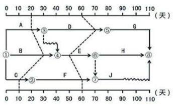 118、某工程双代号时标网络计划执行至第20天和第60天时,检查实际进度如下图前锋线所示,由图可以得出的结论有()。