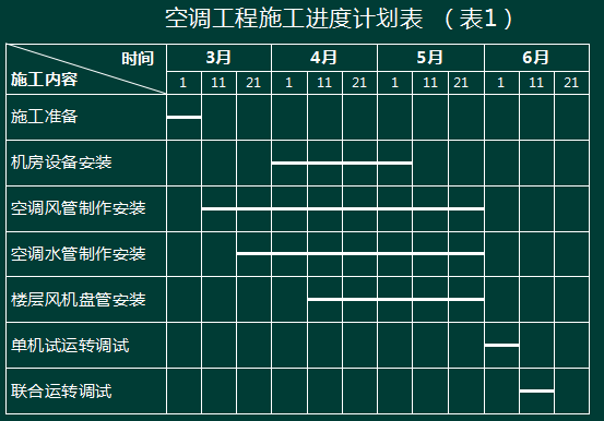 A安装公司进场后,因建设单位采购的设备晚于风管制作安装的开工时间,A安装公司及时联络空调设备供应商,了解设备的各类多数及到场时间并与B建筑公司协调交叉配合施工的时间与节点,编制了施工进度计划(见表1)并根据施工进度计划,制定了能体现合理施工顺序的作业进度计划。为保证安装质量,A安装公司将水机组找正等施工工序设置为质量控制点。