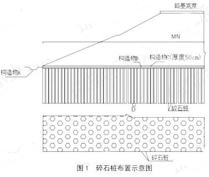 碎石桩采用振动沉管法施工,针对碎石桩施工,施工单位在施工前进行了成桩挤密试验。施工过程中,先开挖纵横排水沟,将农田排水疏干,并清除表层淤泥质土,清基后先铺设0.25m厚的级配碎石并压实,然后进行碎石桩施工,打完碎石桩后铺设土工格栅,再铺设级配碎石垫层。首排碎石桩里程桩号为K1+600,最后一排里程桩号不超过K1+900,基底处理宽度MN为52m,桩位布置不超出此范围。其成桩工艺为: