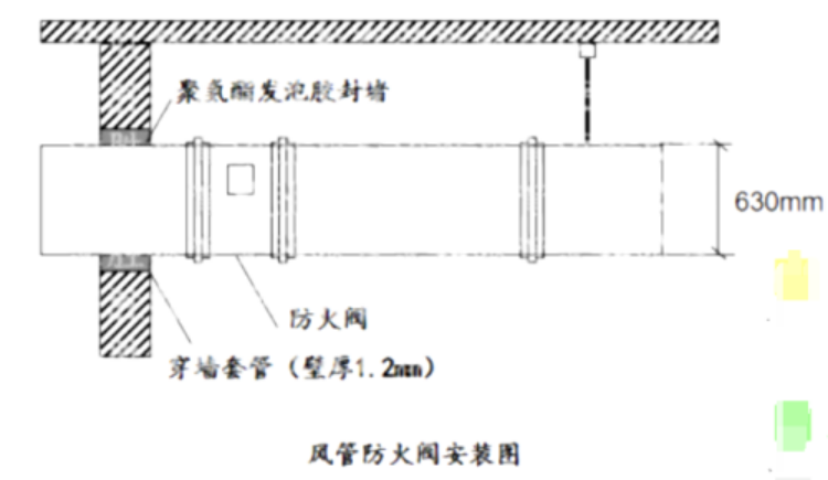 安装公司承接一商务楼的机电安装工程项目,工程内容包括:通风空调,给排水建筑电气和消防工程等。A公司签订合同后经业主同意将消防工程分包给B公司。在开工前,A公司组织有关工程技术人员管理人员依据施工组织设计,设计文件,施工合同和设备说明书等资料,对相关人员进行项目总体交底。A公司项目部进场后,依据施工验收规范和施工图纸制定了金属风管的安装程序:测量放线→支吊架安装-→风管检查-→组合连接-→风管调整-→风管绝热-→漏风量测量→质量检查。风管制作材料有1.0mm,1.2mm镀锌钢板,角钢等,施工后风管板材拼接,风管制作,风管法兰连接等检查均符合质量要求,但防火阀安装风管穿墙(见图1)存在质量问题,监理工程师要求项目部返工,项目组织施工人员返工后,工程质量验收合格。