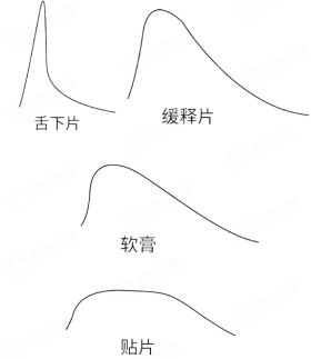 113、硝酸甘油可以制成多种剂型,进而产生不同的吸收速度、起效时间、达峰时间和持续时间(药时曲线、相关参数如下)