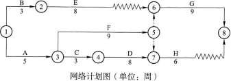 某机场围界入侵报警系统工程施工网络计划如下图所示,其中A——围界报警系统供电与网络线缆敷设,B——视频监控子系统线缆敷设,C——红外对射探测器安装,D——现场报警器安装调试,E——视频监控子系统现场设备安装,F——辅助灯光照明安装,G——视频监控子系统调试,H——红外对射探测子系统调试,该工程合同工期为25周。