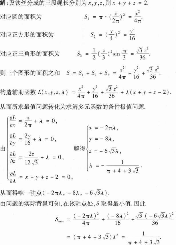 17、将长为2m的铁丝分成三段,依次围成圆、正方形与正三角形.三个图形的面积之和是否