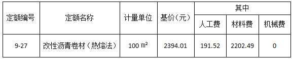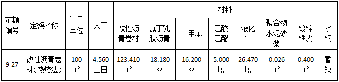 因该企业无企业定额,故参考《陕西省建设工程消耗量定额》(2004)计算消耗量,定额编号9-27,见表3-2。经市场询价,人工单价120元/工日。APP卷材23元/㎡,其余材料、机械单价均采用《陕西省建设工程价目表》(2009)价格,见表3-3。