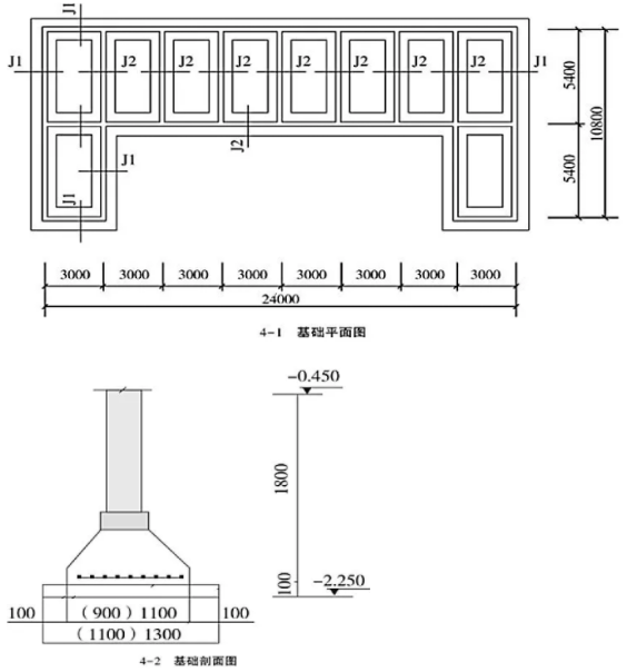 某工程基础平面图及详图如图4-1、图4-2所示、工程条件为:二类土(普通土),基础采用人工开挖,土方槽边就近堆放,槽底无需钎探,常地下水位为-2.40m。C15混凝土垫层,C25混凝土基础,基础墙厚240mm。