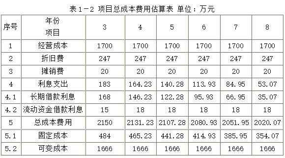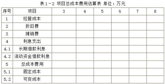 2.填写项目的总成本费用(不含可抵扣的进项税额)估算表1-2,并计算项目的年平均固定成本及单位可变成本。