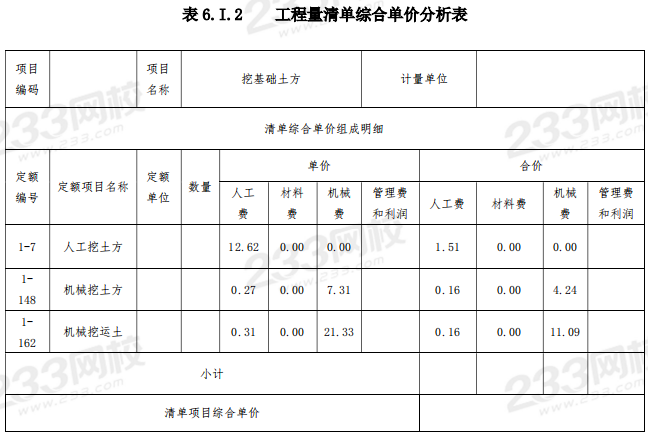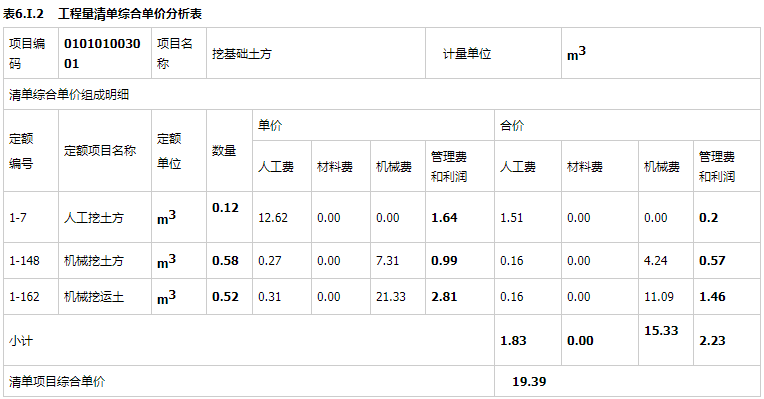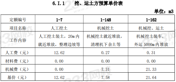 2.根据工程所在地相关部门发布的现行挖、运土方预算单价,见表6.I.1“挖、运土方预算单价表"。施工方案规定,土方按90%机械开挖、10%人工开挖,用于回填的土方在20m内就近堆存,余土运往5000m范围内指定堆放地点堆放。相关工程的企业管理费按人材机之和的7%计算,利润按人材机之和的6%计算。编制挖基础土方(编码为010101003)的清单综合单价,填入答题纸6.l.2“工程量清单综合单价分析表"。