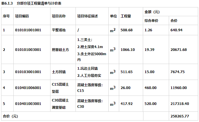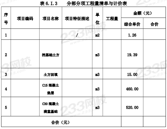 3.利用第1、2问题的计算结果和以下相关数据,在答题纸表6.l.3“分部分项工程量清单与计价表"中,编制该烟囱基础分部分项工程量清单与计价表,已知相关数据为:①平整场地,编码010101001,综合单价1.26元/m2;②挖基础土方,编码010101003;③土方回填,人工回填,人工分层夯填,编码010103001,综合单价15.00元/m3;④C15混凝土垫层,编码010401006,综合单价460.00元/m3;⑤C30混凝土满堂基础,编码010401003,综合单价520.00元/m3。