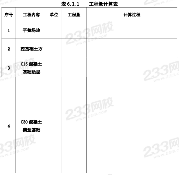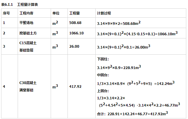 1.根据上述条件,按《建设工程工程量清单计价规范》GB50500-2013的计算规则,在答题纸表6.1.1“工程量计算表"中,列式计算该烟囱的平整场地、挖基础土方、垫层和混凝土基础工程量。平整场地工程量按满堂基础底面积乘2.0系数计算。