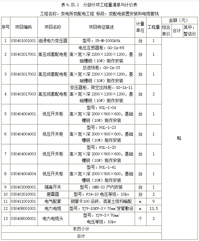 1.按照背景资料1、3、4和图6.Ⅲ.1~图6.Ⅲ.3所示内容,编制表6.Ⅲ.1该工程变配电装置安装和电缆管线的“分部分项工程量清单与计价表”。