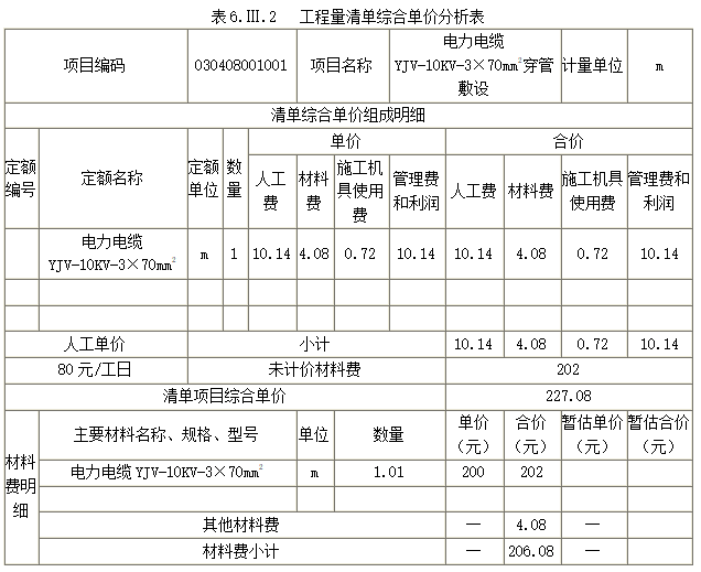 3.该工程变配电装置中的全部母线,均由生产厂家制作安装。人工费单价为80元/工日,管理费和利润分别为人工费的60%和40%计算。