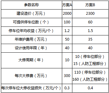 因此,设计院对该项目地下部分提出了两个设计方案:方案A为不建人防工程,地下可利用空间用于建停车场;方案B为建规定规模的人防工程,剩余可利用空间用于建停车场。