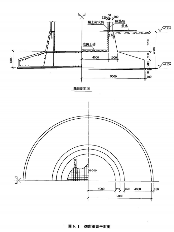 5、某钢筋混凝土圆形烟囱基础设计尺寸,如图6.I所示。其中基础垫层采用C15混凝土,圆形满堂基础采用C30混凝土,地基土壤类别为三类土。土方开挖底部施工所需的工作面宽度为300mm,放坡系数为0.33,放坡自垫层上表面计算。