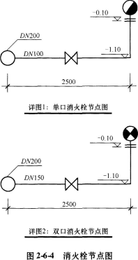 (3)DN≥100的阀门均为带短管甲乙的法兰阀口,闸阀型号为Z41T-16,止回阀型号为H41T-16。消火栓S1~S8为地上式单口消火栓,S9、S10为地上式双口消火栓,消火栓均为成套供应,包括底座,连接消火栓的垂直管段按法兰铸铁管计,连接形式分别见图2-6-4。
