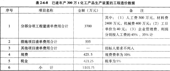 某施工企业于两年前在城内承建了一套年产300万t同类化工产品的生产装置,设备总重量1600t,其相关工程造价数据详见表2-6-8。