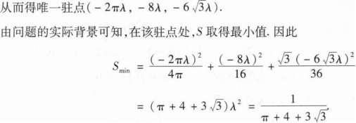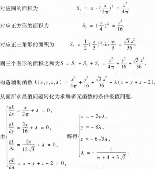 19、将长为2m的铁丝分成三段,依次围成圆、正方形和正三角形,三个图形的面积之和是否存在最小值?若存在,求出最小值.