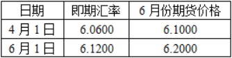 140、4月1日,国内某公司有200万美元的应付账款,到期日为6月1日。为规避汇率波动风险,该公司于当天买入20手6月份到期的美元兑人民币期货合约。至6月1日,该公司在即期外汇市场买入美元用于支付账款,同时将6月份期货合约对冲平仓。4月1日和6月1日相关市场汇率如下表所示。(合约规模为每手10万美元,不计手续费等交易费用)