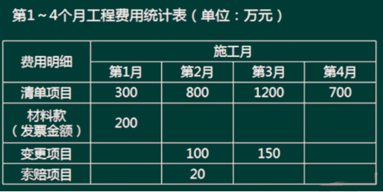 某堤防工程施工招标文件依据《水利水电工程标准施工招标文件》(2009年版)编制。经公开招标,发包人与承包人签订了施工合同,签约合同价3000万元,其中暂列金额126万元,计划工期4个月。合同签订前,承包人按招标文件规定提交了履约保证金。工程施工期间第1~4个施工月发生的工程费用见下表。