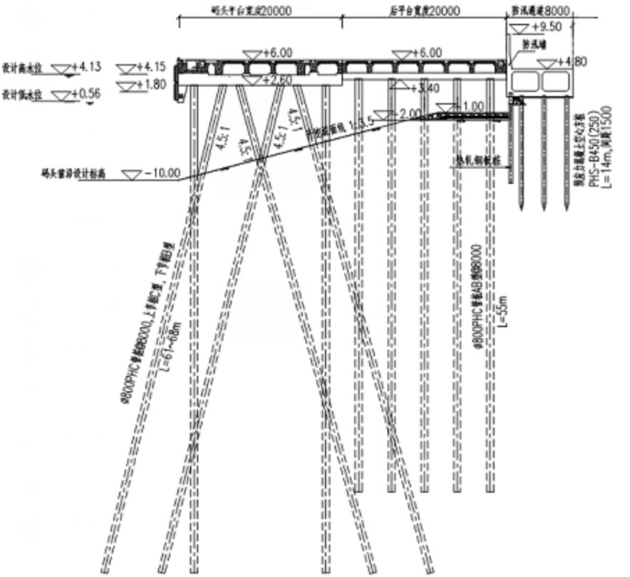 31、某新建高桩梁板式码头总长为500m,码头分为码头平台、后平台及接岸防汛通道三部分,码头断面见图1。码头平台由桩基、横梁、纵梁、面板、靠船构件、面层、附属设施等组成。在承建项目部编制的施工组织设计中,码头桩基需在港池边坡开挖后进行水上沉桩,后平台及防汛通道的桩基采用陆上沉桩,沉桩过程中要采取有利于边坡稳定的措施。项目部通过精心组织,按照合同要求完成了施工任务。该工程横梁的混凝土强度等级为C40,混凝土立方体抗压强度验收批试件共有20组,经计算,平均强度为43.6MPa,其中最低值为38.7MPa,标准差为2.4MPa。