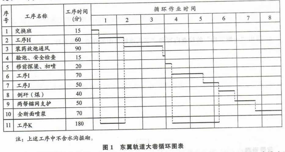(2)采用台阶法施工时,上台阶工作面超前5m(高度3.0m),上、下台阶炮眼施工分步进行,上台阶炮眼先于下台阶炮眼施工,上、下台阶同时起爆,倒歼后一次性完成两帮支护工作。出砰利用P-120B型耙装机,采用正规循环作业,循环图表如图1所示。