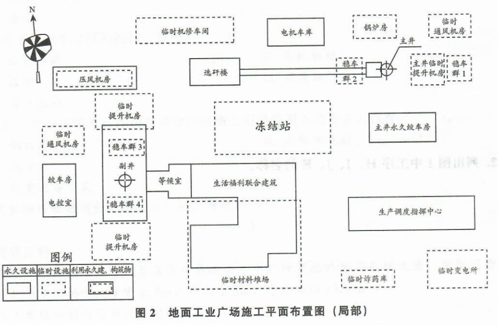 某施工单位承建一矿井主、副立井井筒工程,主、副井筒均布置在同一工业广场内,均采用冻结法施工。开工前施工单位进行了充分的施工准备,会审了施工面,完善了施工组织设计。根据施工进度计划,主井井筒到底后进行临时改绞,副井进行永久装备。施工组织设计中,井筒周围主要临时施工设施布置如图2所示。