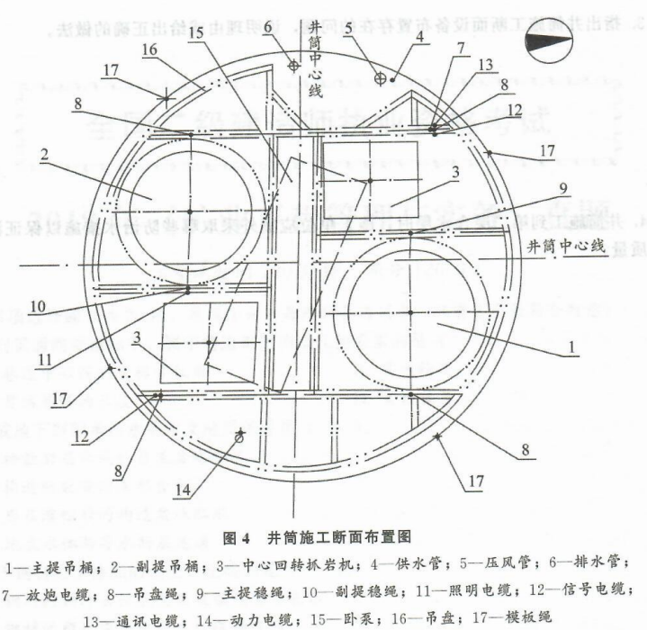 施工单位根据工程条件和相关规定编制了井筒的施工组织设计,井筒施工断面布置如图4所示,主要凿井施工设备选型及配置为:II型立井凿井钢井架;1台JKZ-2.8提升机配2.0m³吊桶和1台JK-2.5提升机配1.0m³吊桶提升;1台FJD-6伞钻打眼;1台HZ-4和1台HZ-6中心回转抓岩机装岩。