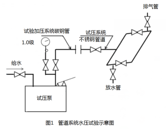 某安装公司承包大型制药厂的机电安装工程,工程内容:设备、管道和通风空调等工程安装。安装公司对施工组织设计的前期实施,进行了监督检查:施工方案齐全,临时设施通过验收,施工人员按计划进场,技术交底满足施工要求,但材料采购因资金问题影响了施工进度。不锈钢管道系统安装后,施工人员用洁净水(氯离子含量小于25ppm)对管道系统进行试压时(见图1),监理工程师认为压力试验条件不符合规范规定,要求整改。由于现场条件限制,有部分工艺管道系统无法进行水压试验,经设计和建设单位同意,允许安装公司对管道环向对接焊缝和组成件连接焊缝采用100%无损检测,代替现场水压试验,检测后设计单位对工艺管道系统进行了分析,符合质量要求。检查金属风管制作质量时,监理工程师对少量风管的板材拼接有十字形接缝提出整改要求。安装公司进行了返修和加固,风管加固后外形尺寸改变但仍能满足安全使用要求,验收合格。